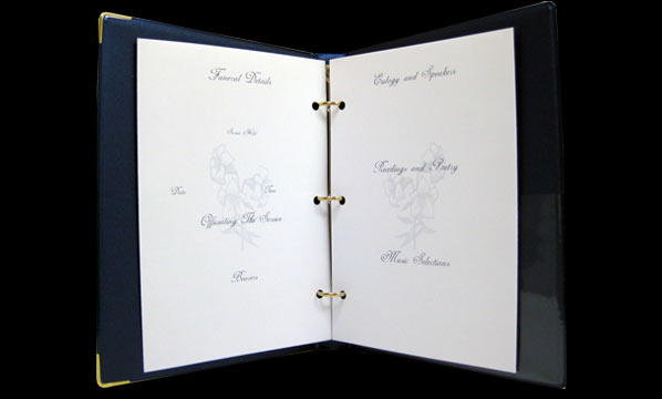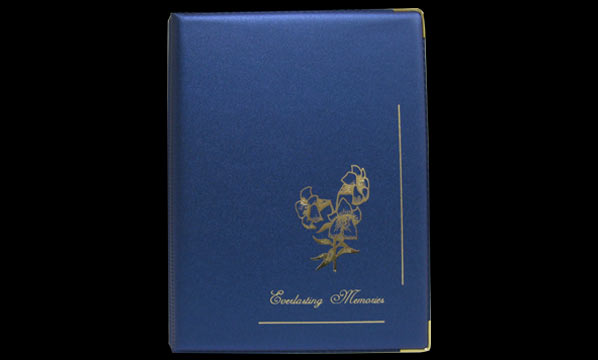 High quality Australian-made memorial book featuring a metallic blue cover with a gold foil orchid.