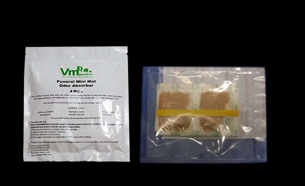 The Funeral Mini Mat is an odour-eliminator for the air. Designed for use in funerals where the deceased have been embalmed, the mat will eliminate any unexpected chemical odours as well as decomposition odours (if there were complications with the embalming procedure). The use of the Mini Mat can also reduce chemical odours in work and storage areas after preparation of the deceased. It has double-sided tape allowing it to be adhered to a surface within the area being treated. Ideally, the mat would be placed horizontally, paper-side down, and above the source of the odour. Alternatively, it may be placed on the wall for easier application (although effectiveness may be reduced).